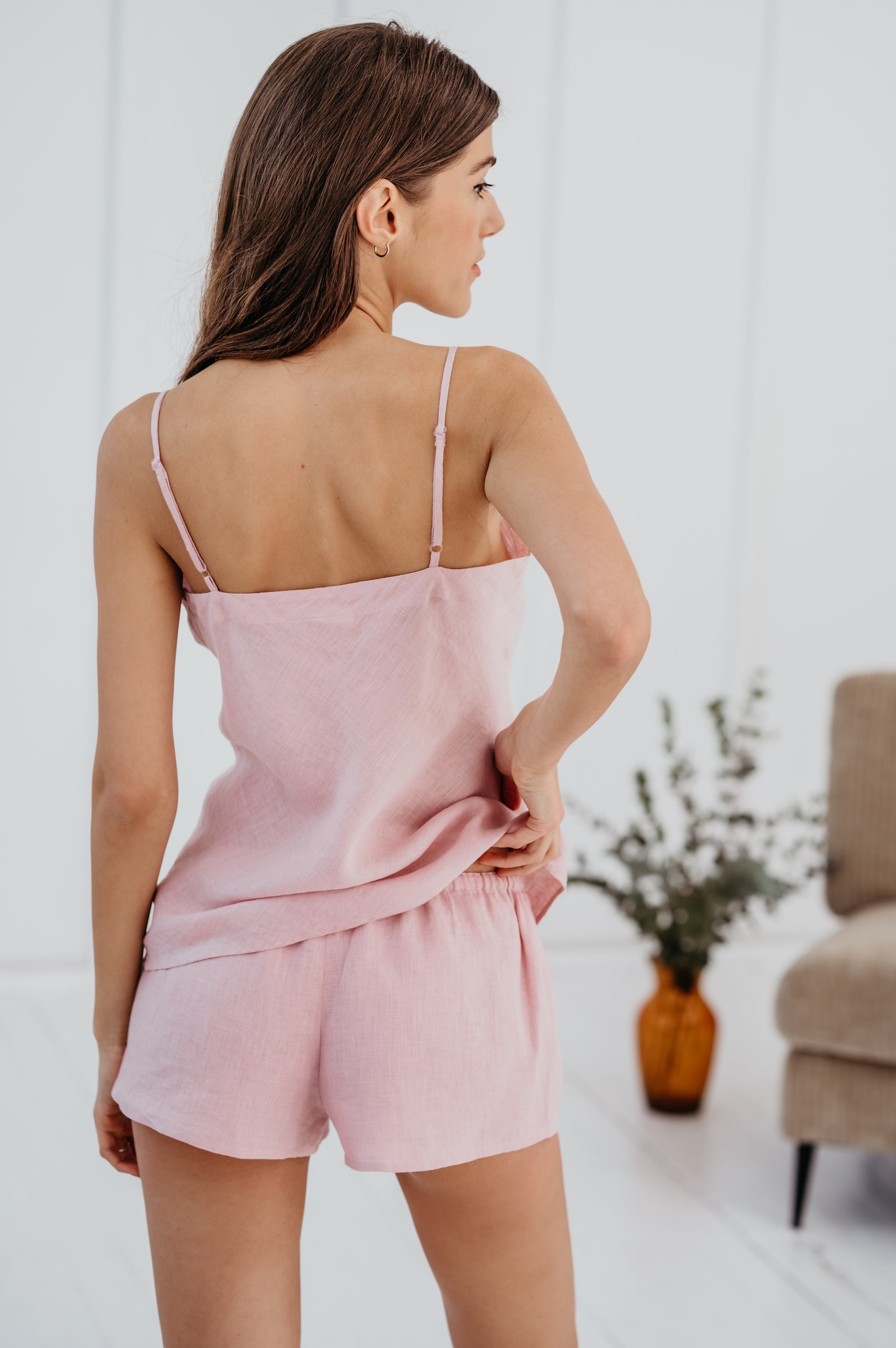 This set features a simply styled top with adjustable straps and boxer shorts with a drawstring waist. It's perfect for summer nights or slow days at home. The breathable linen ensures full comfort.