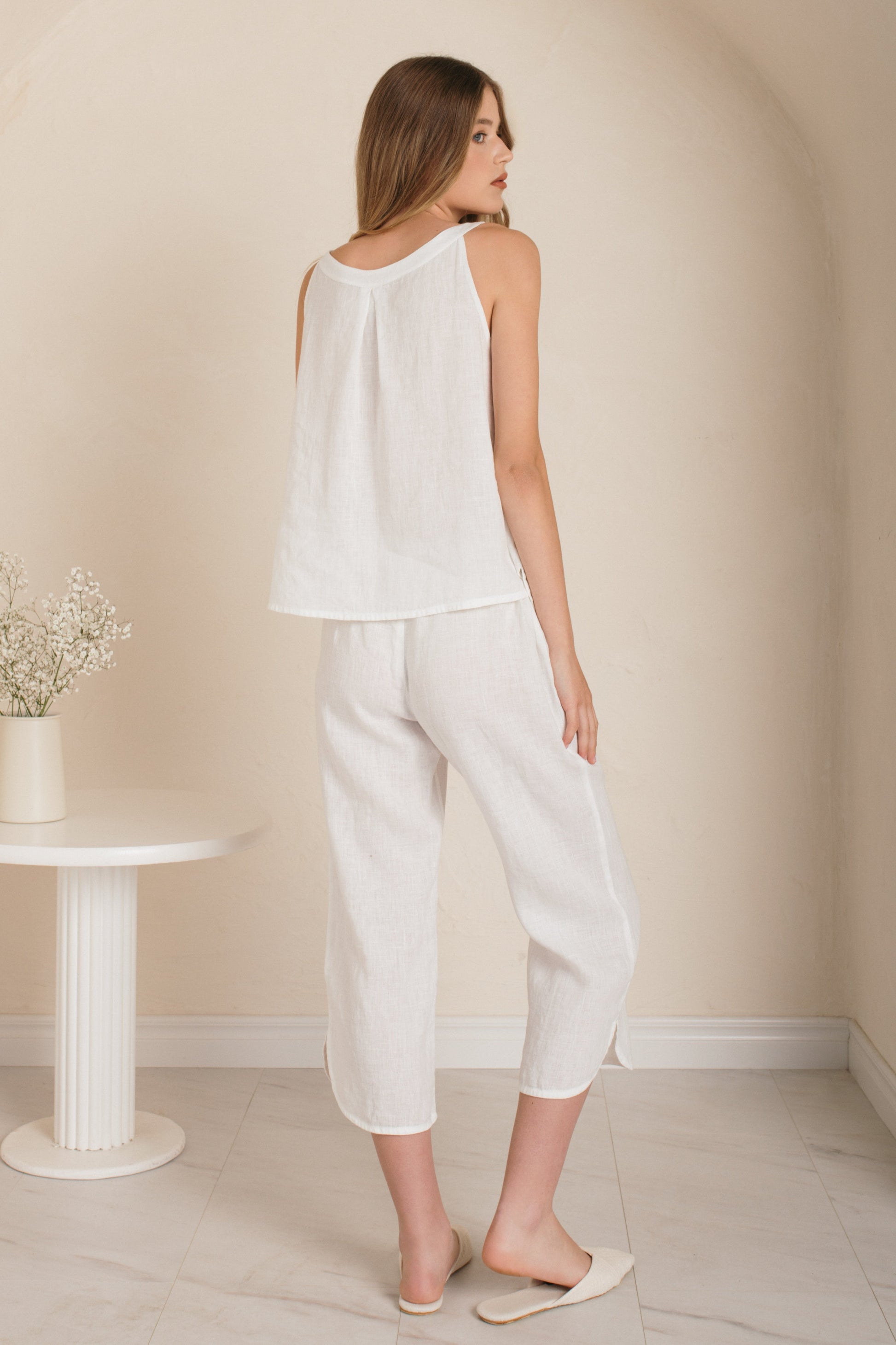 Linen cute babydoll style pajama set with cropped pants in white linen.