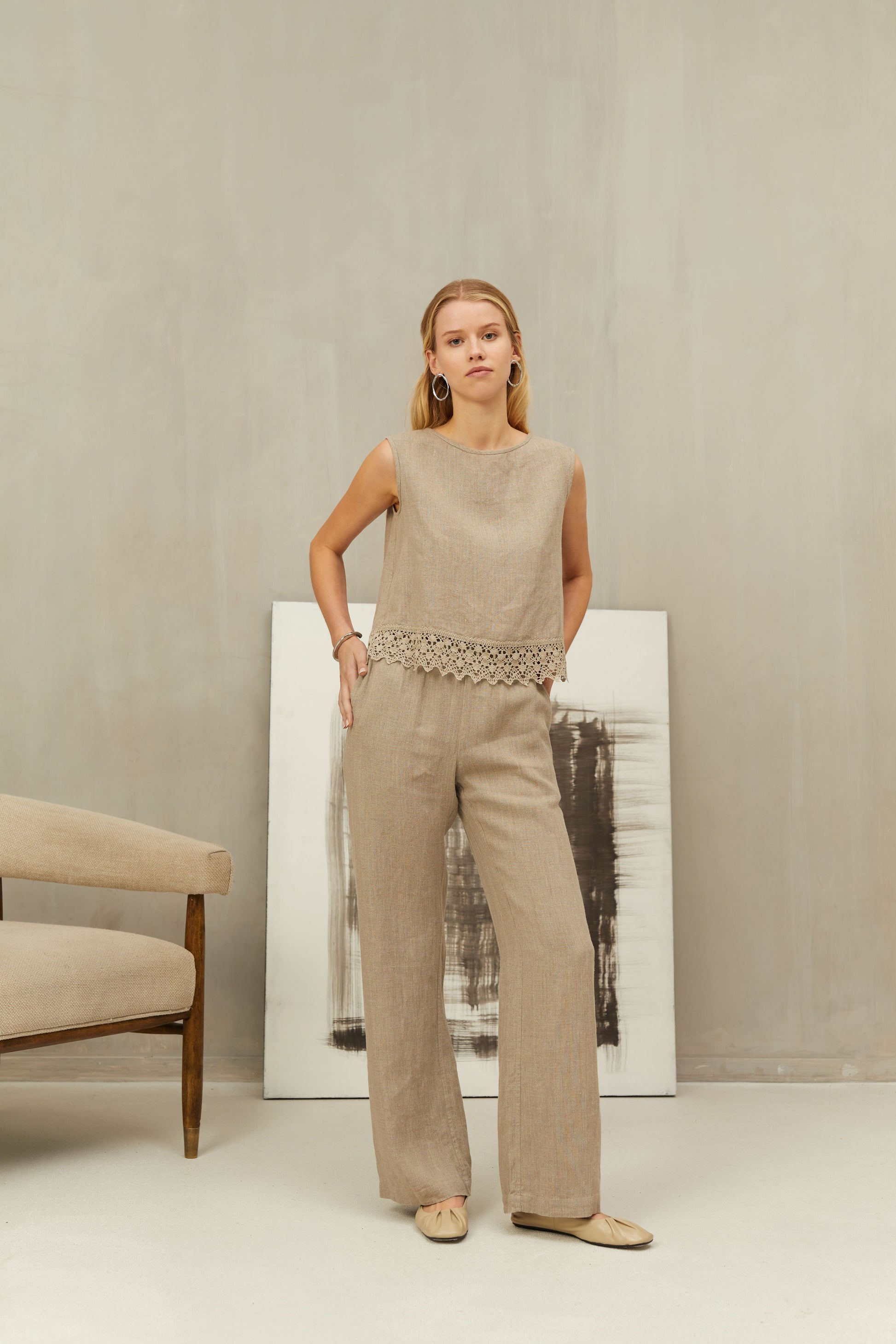 Linen suit women's with lace decor at top waist line. Simple and elegant outfit - suitable for important occasions. Be elegant in linen.