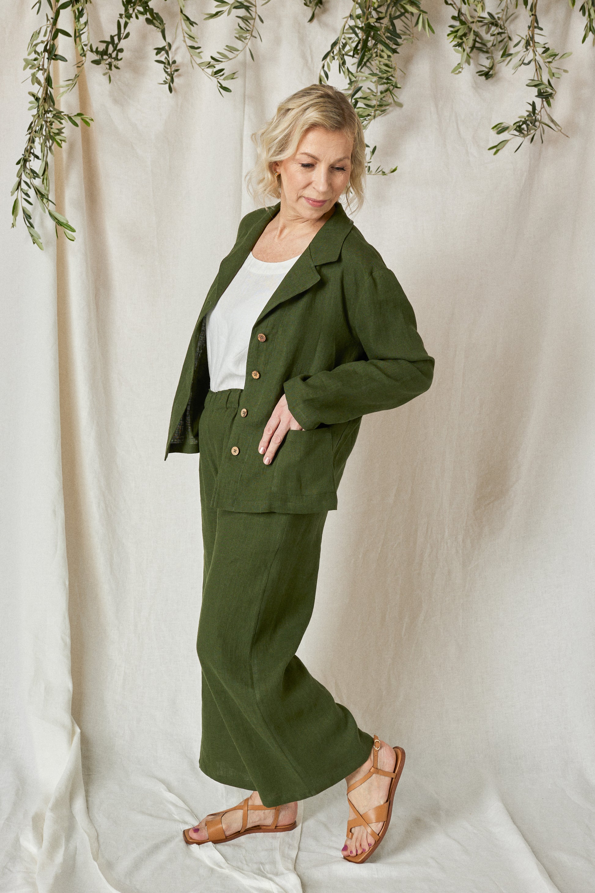 Model of size S wears trouser in Dark khaki color linen of size L