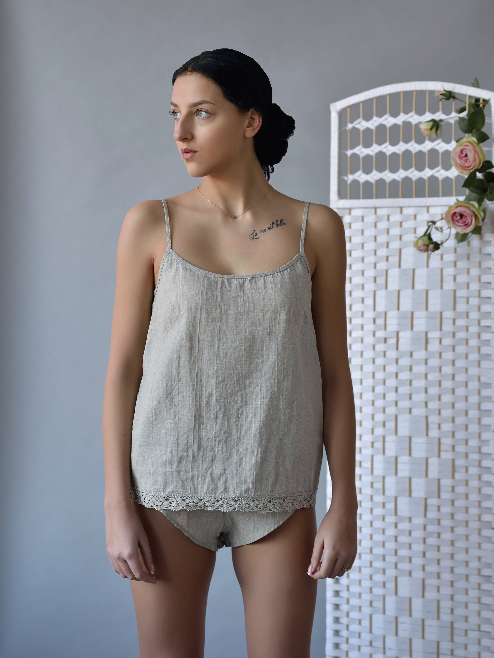 Wrap yourself in timeless comfort with our LGlinen Light Blue Linen Sleepwear Set — a perfect blend of softness, romance, and effortless style. Handcrafted from 100% natural linen, this beautiful two-piece pajama set includes a delicate camisole top and matching shorts with lace, designed to make you feel feminine, free, and comfortably elegant.
