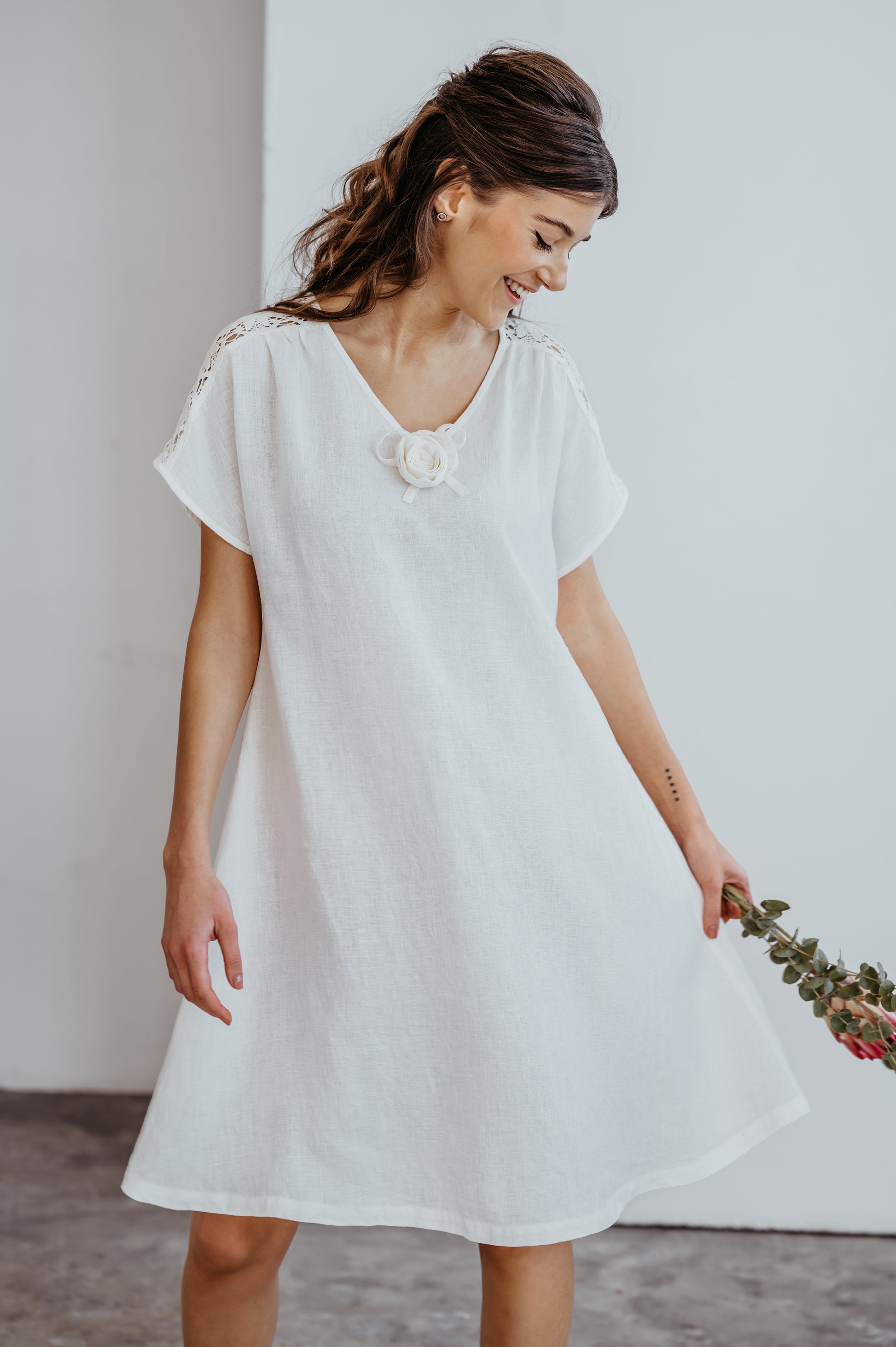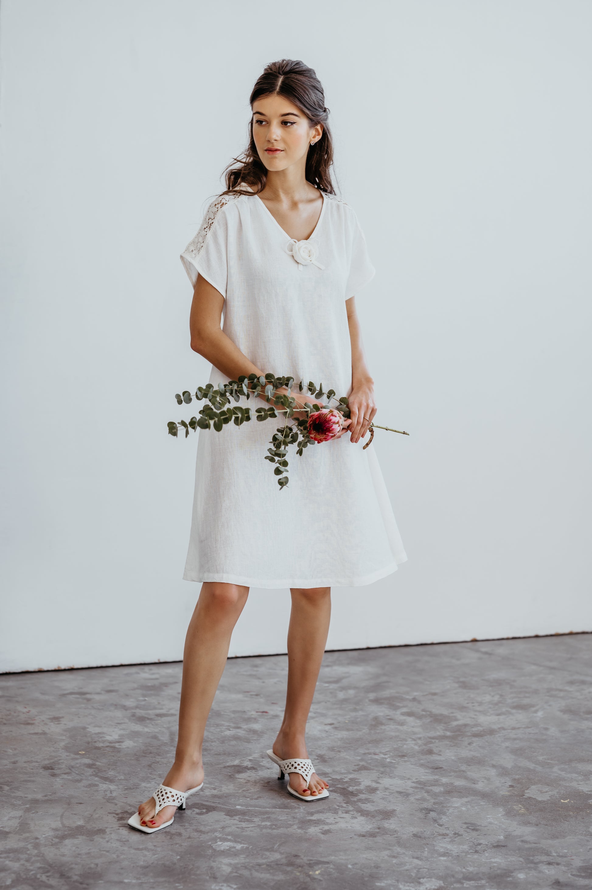 On picture model of size S and 5'9" high wears dress in size S, milky white color linen