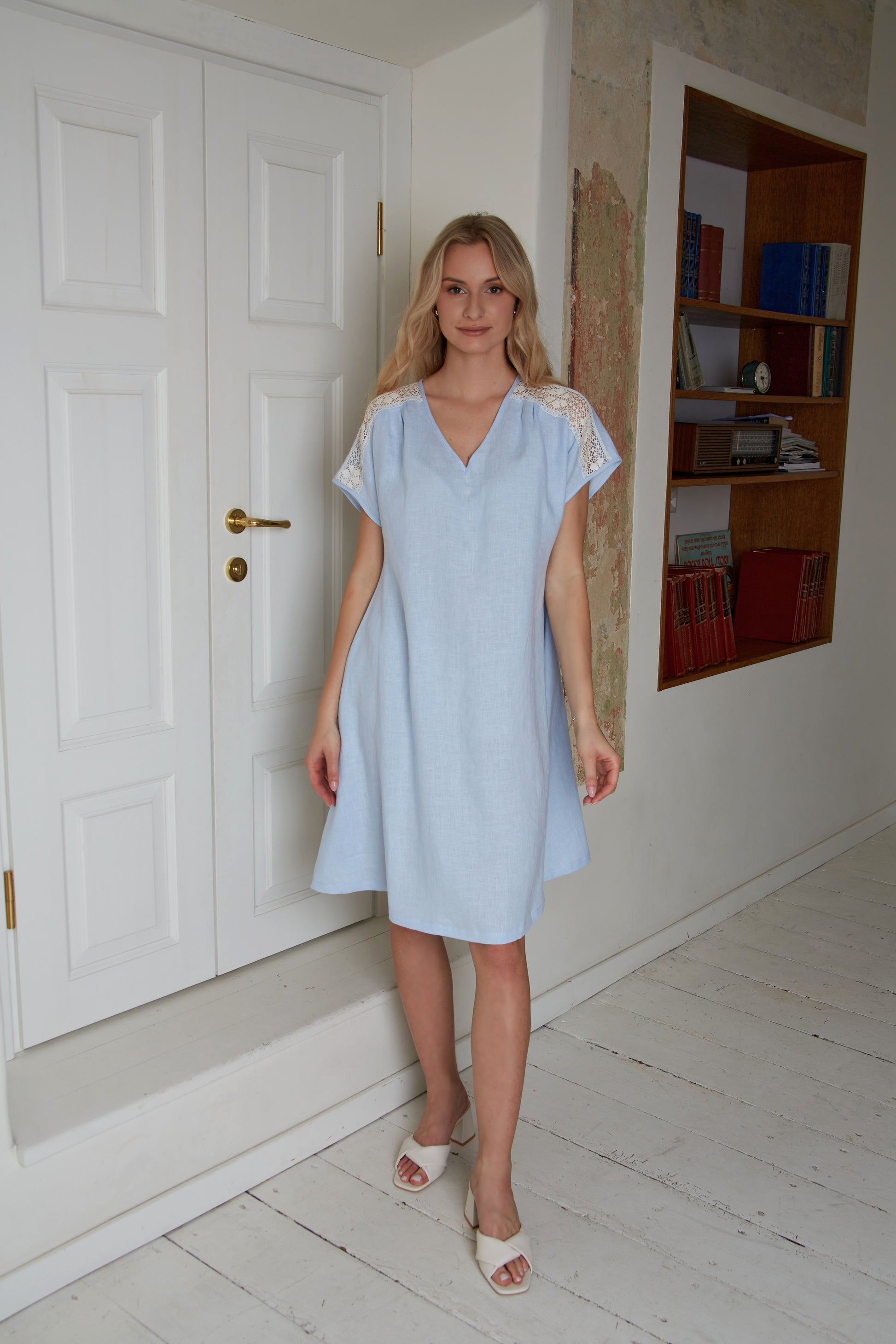 Linen Dress AMELIA LACE With Flared Bottom in Blue