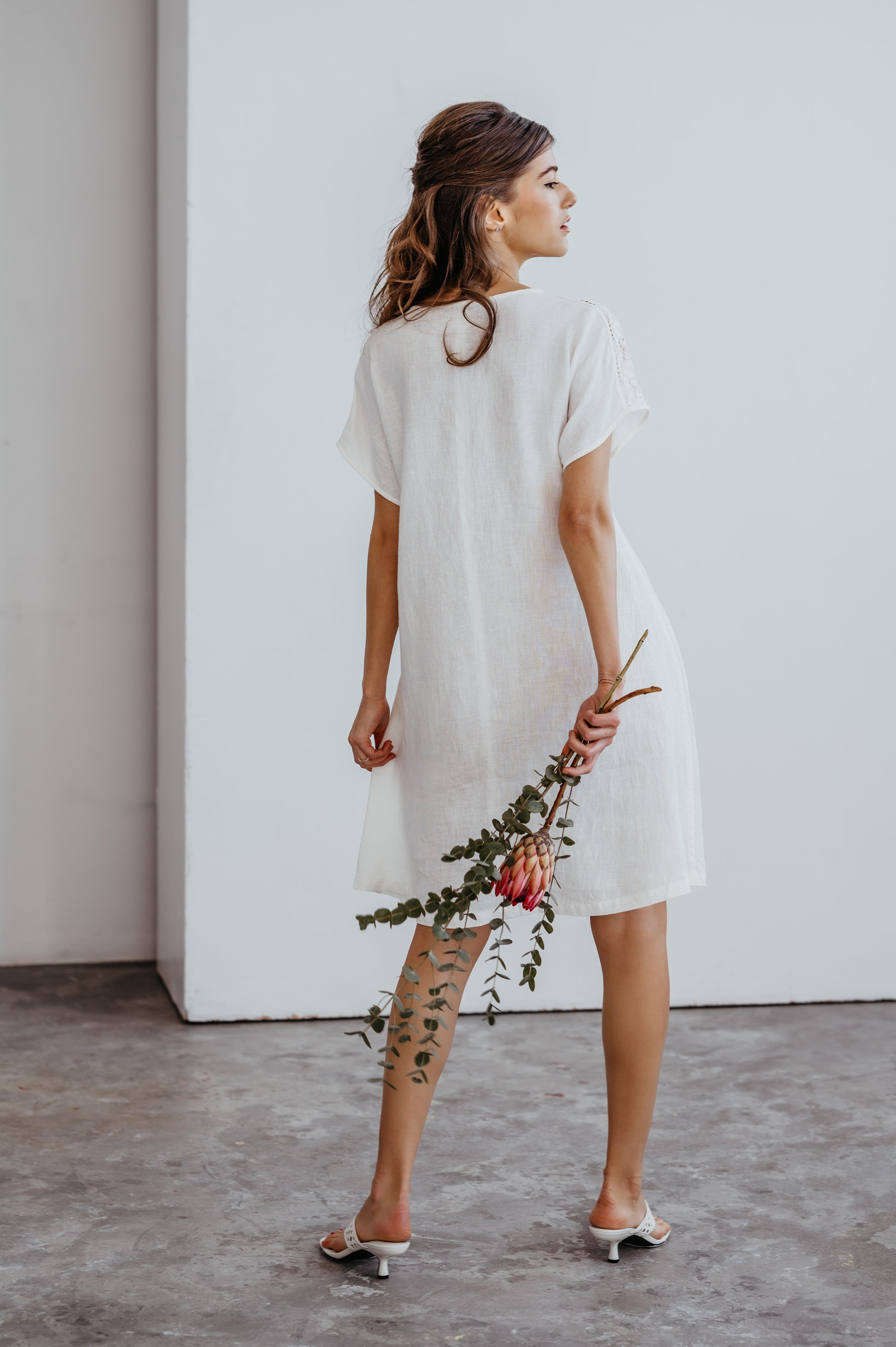 On picture model of 173 cm (5'7") height wears dress in milky white linen size S.Ā