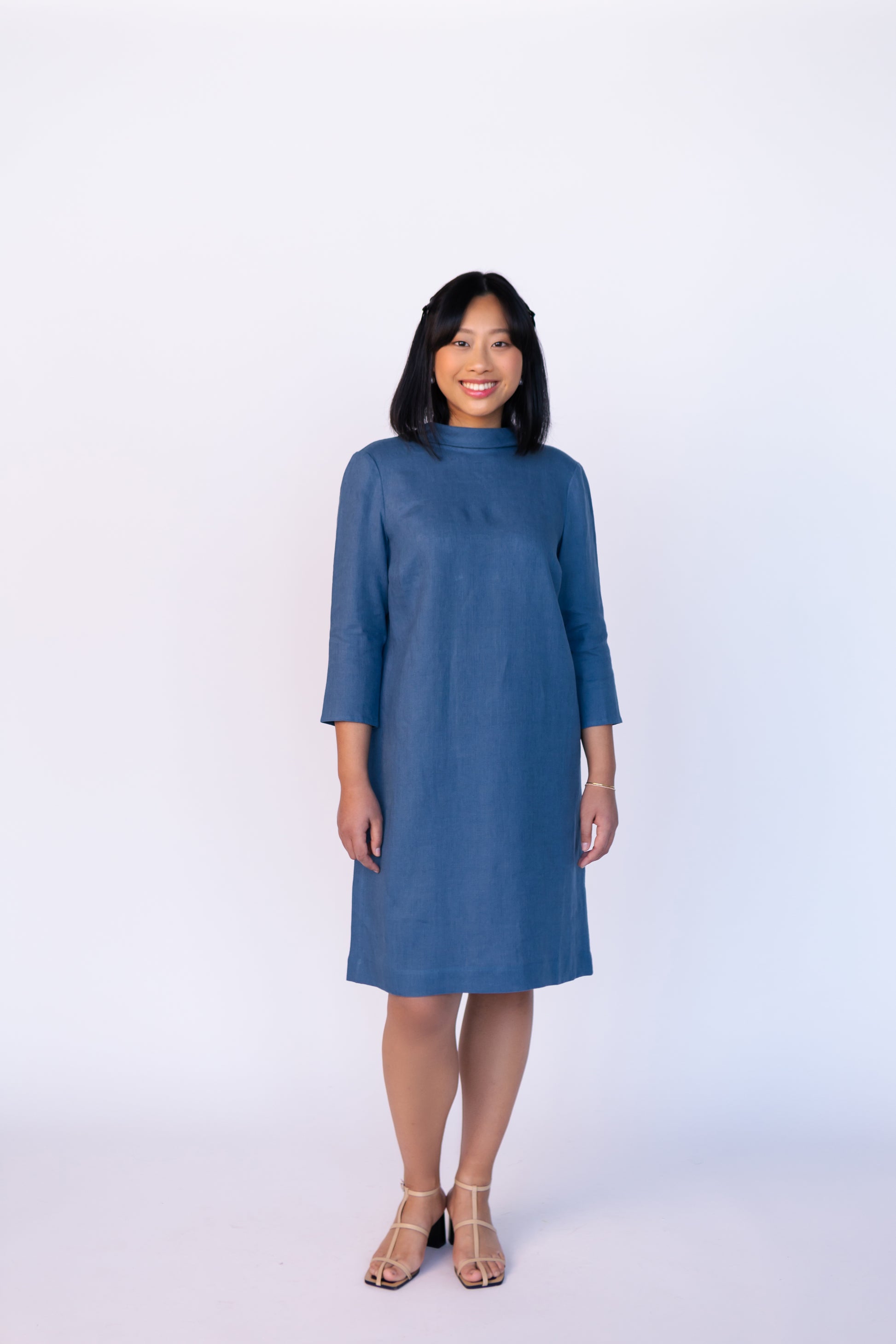 On picture model of height 175 cm size M  wears dress in denim blue and L size dress in pale blue color linen.