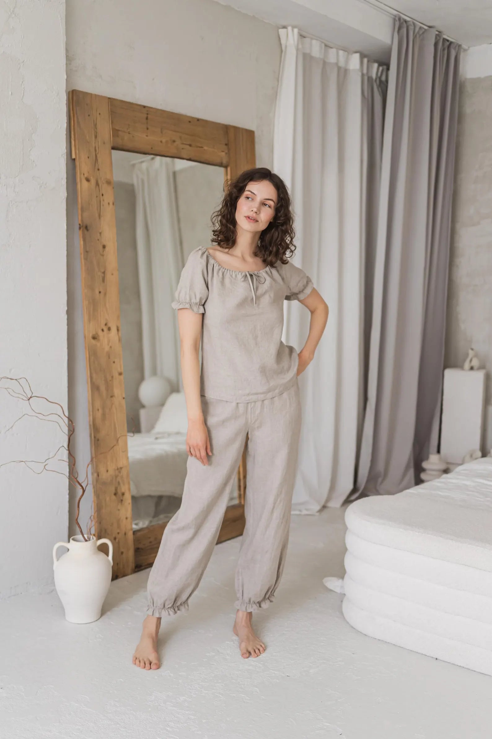 Feminine loungewear with ruffles on the sleeves and pants bottom, adding a touch of lightness and softness.