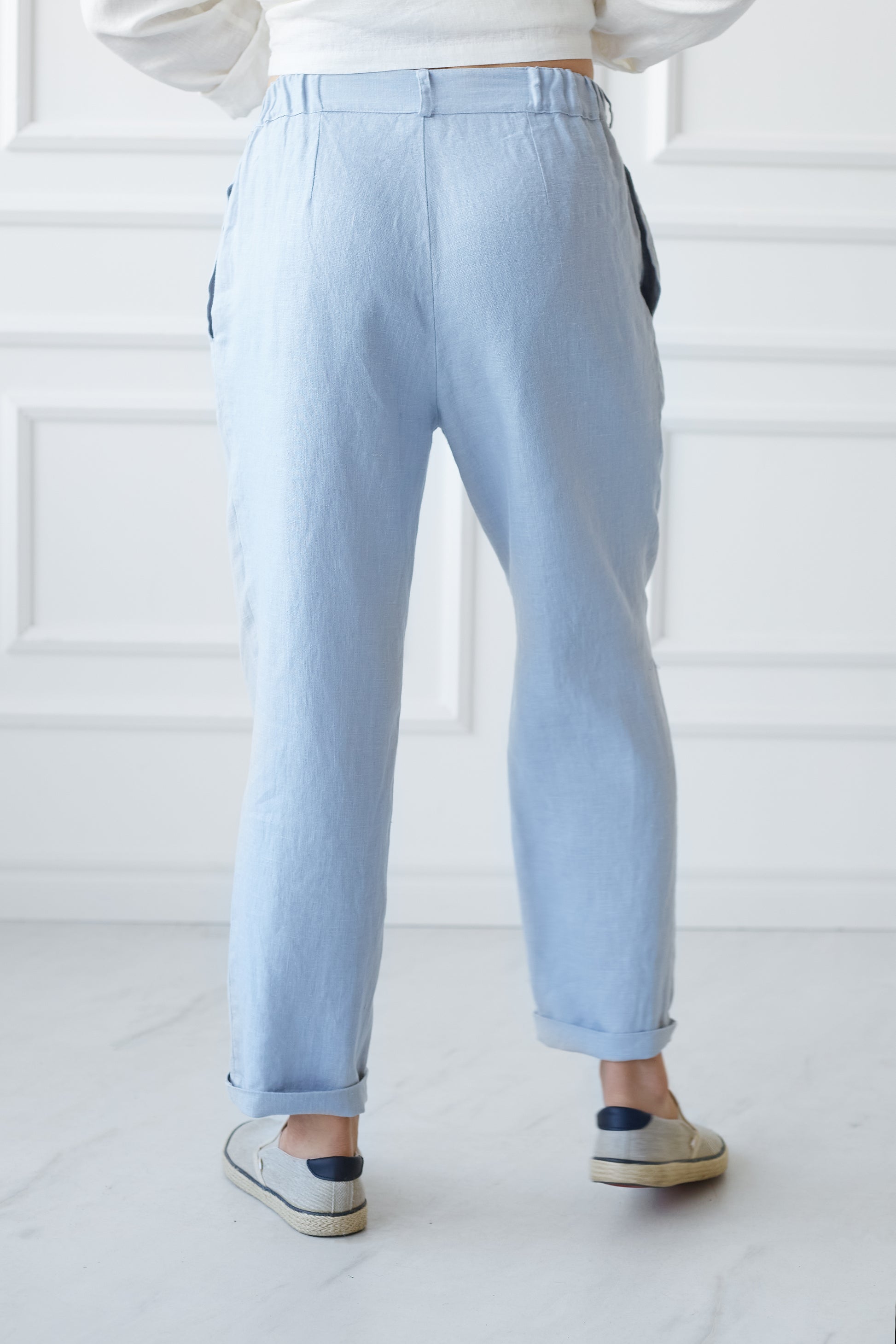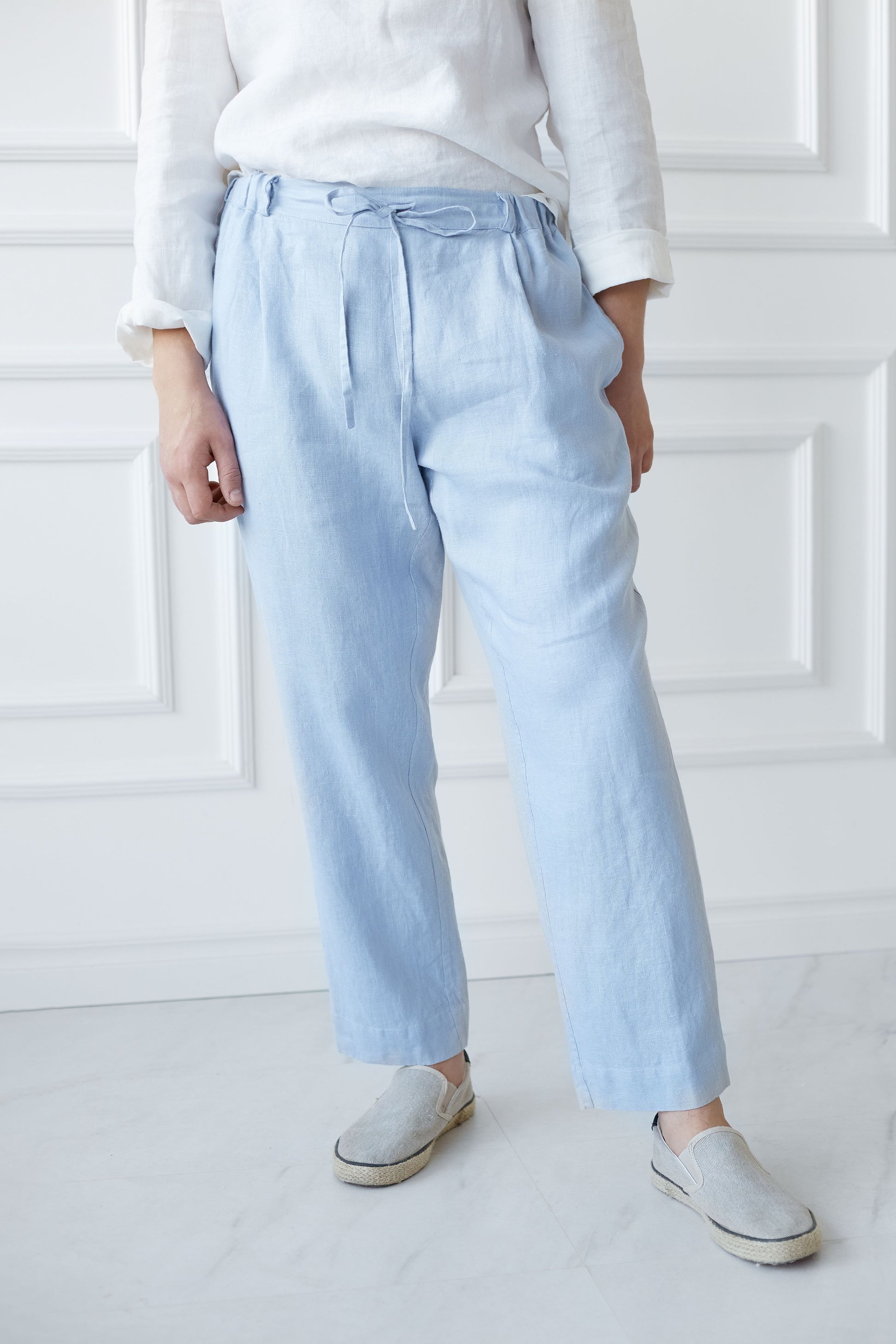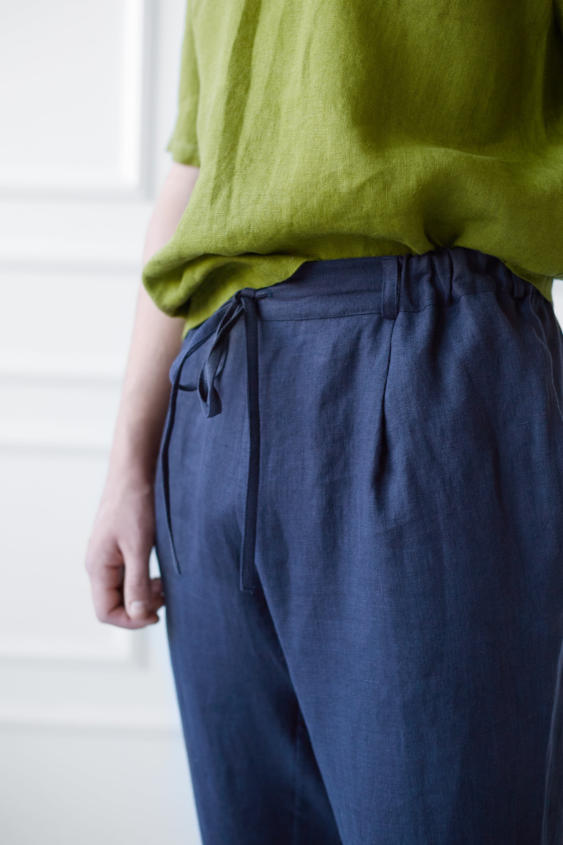 On picture model of size S wears trouser in size S, asphalt grey/blueish grey linen.